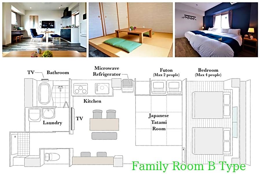 Travelers can choose from a range of room styles, from family-friendly retreats to spacious apartments. The Family option spans 592 square feet and accommodates 2 adults and 1 child, with 2 double beds and 2 futon mats. For bigger groups, the Apartment accommodates up to 10 adults and 6 children and offers 2 double beds. In-room conveniences include a kitchen, kitchenette, and kitchenware; non-smoking rooms are available, along with free toiletries, a bidet, and a bathtub. Modern comforts like free WiFi with Netflix streaming, air conditioning, and a 24-hour front desk keep stays easy, while an elevator adds effortless access.